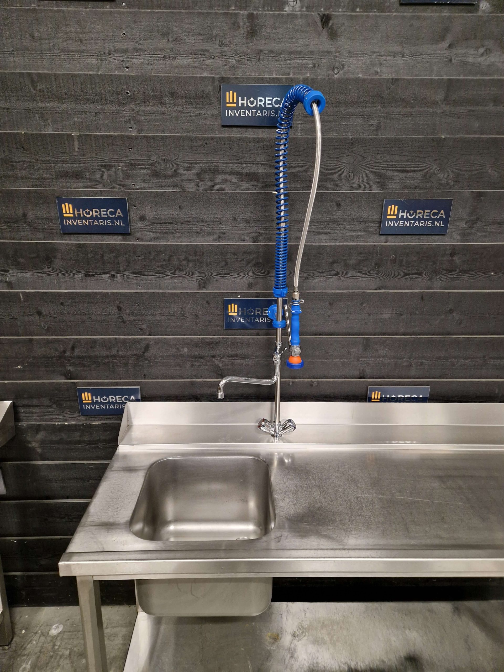 De linkertafel is uitgerust met een spoelbak voor het voorspoelen van servies en bestek, terwijl de rechtertafel dient als ruime afvoertafel voor schone vaat.