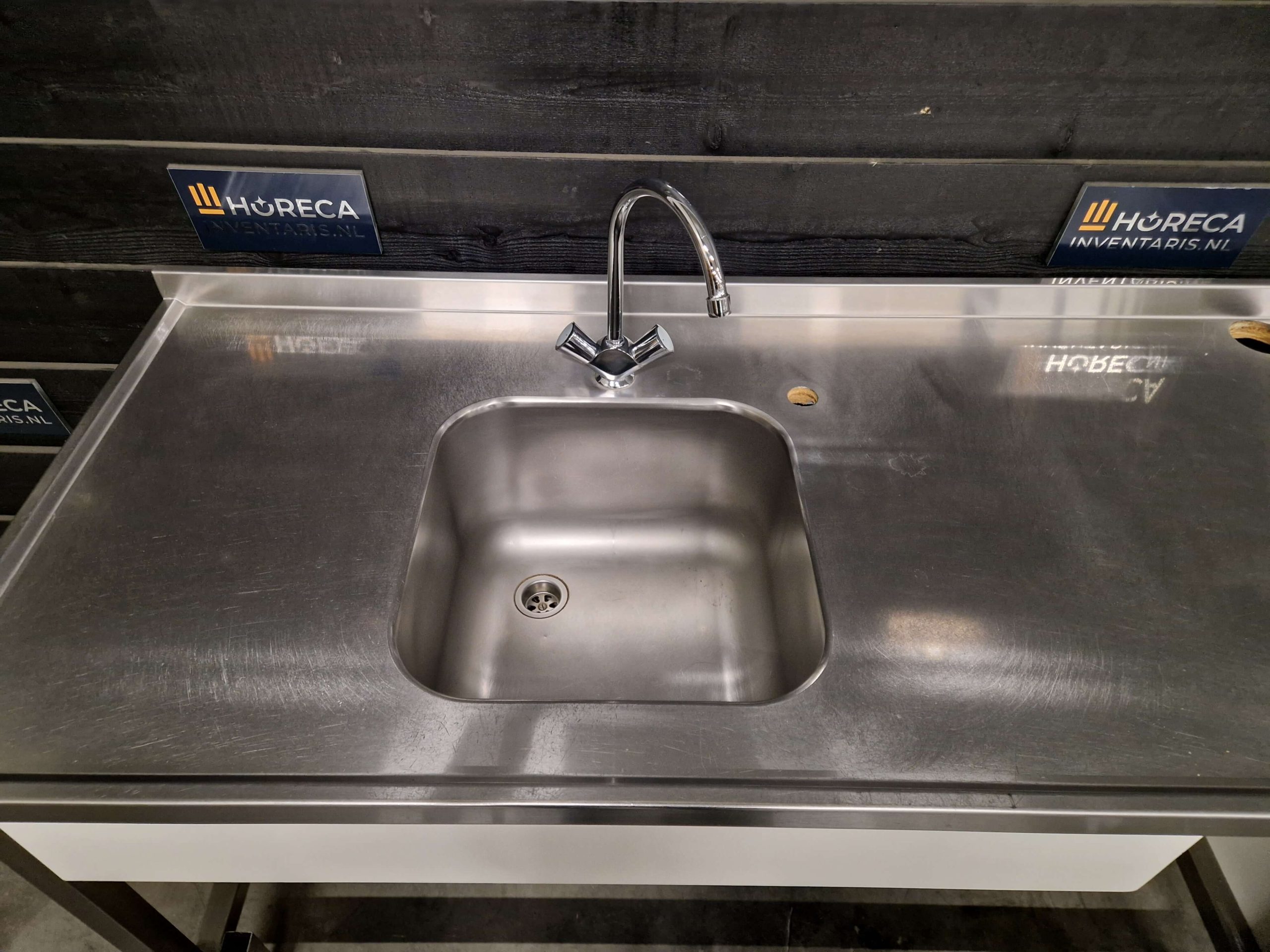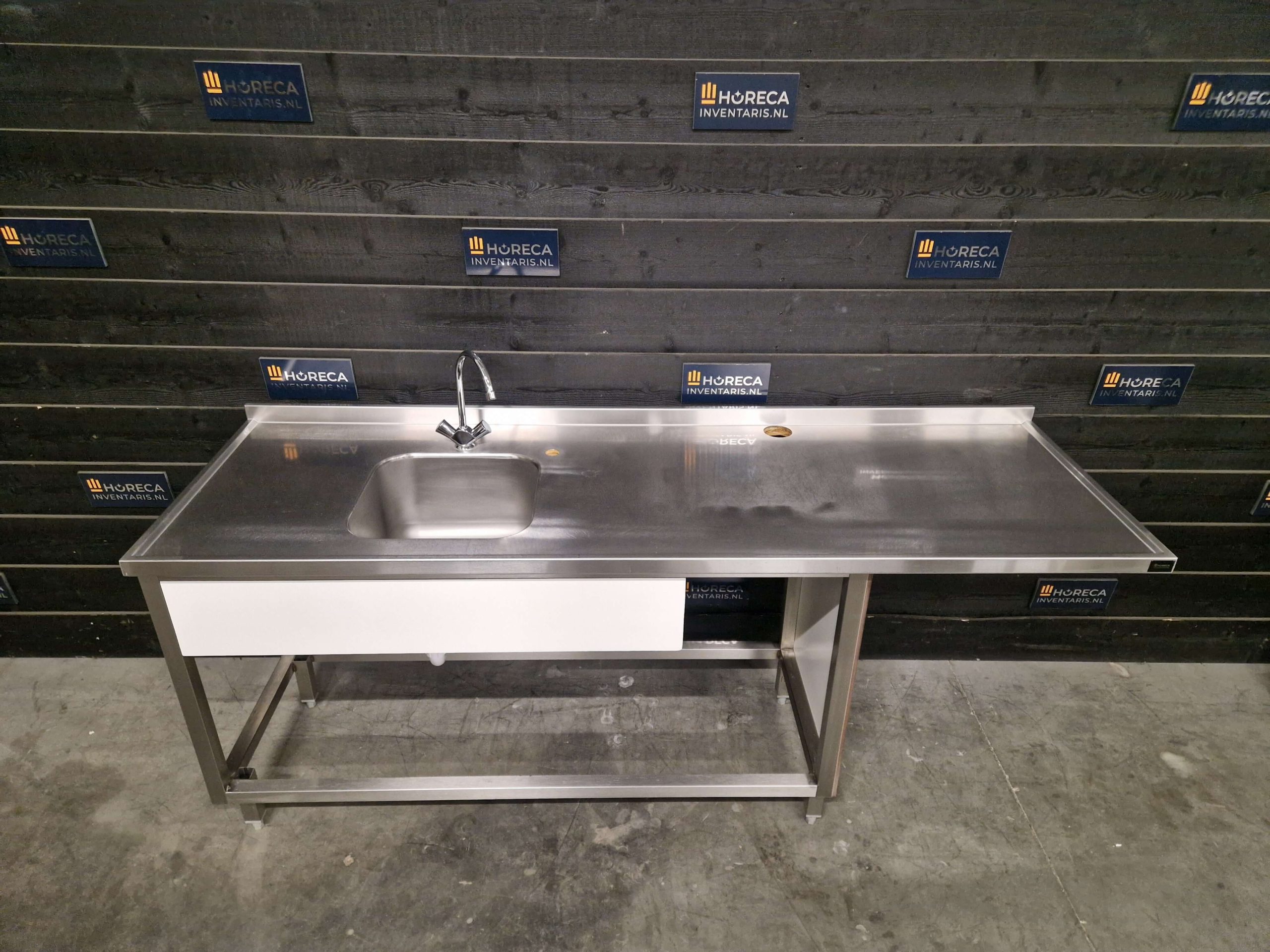 De wastafel is voorzien van een ingebouwd gat van 60 cm, speciaal geschikt voor het plaatsen van een voorlader-vaatwasser. Hierdoor kan de machine naadloos worden geïntegreerd, wat zorgt voor een ergonomische en soepele doorloop tijdens het afwasproces.