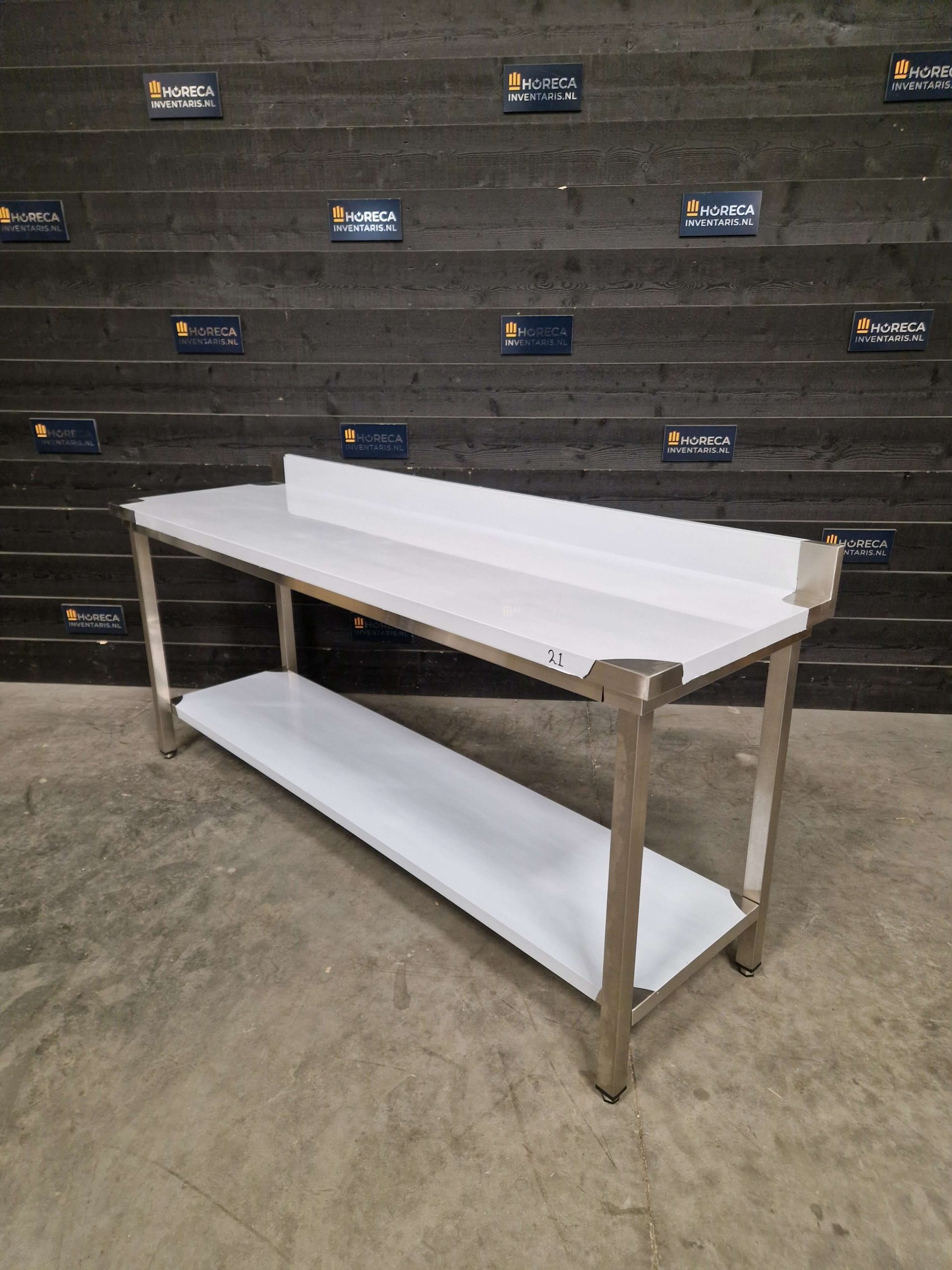 De tafel is voorzien van een praktische onderligger voor extra opbergruimte. Daarnaast beschikt het werkblad over een opstaande rand aan de achterzijde, wat helpt om spatten en vuil tegen te houden en te voorkomen dat items van de tafel vallen.